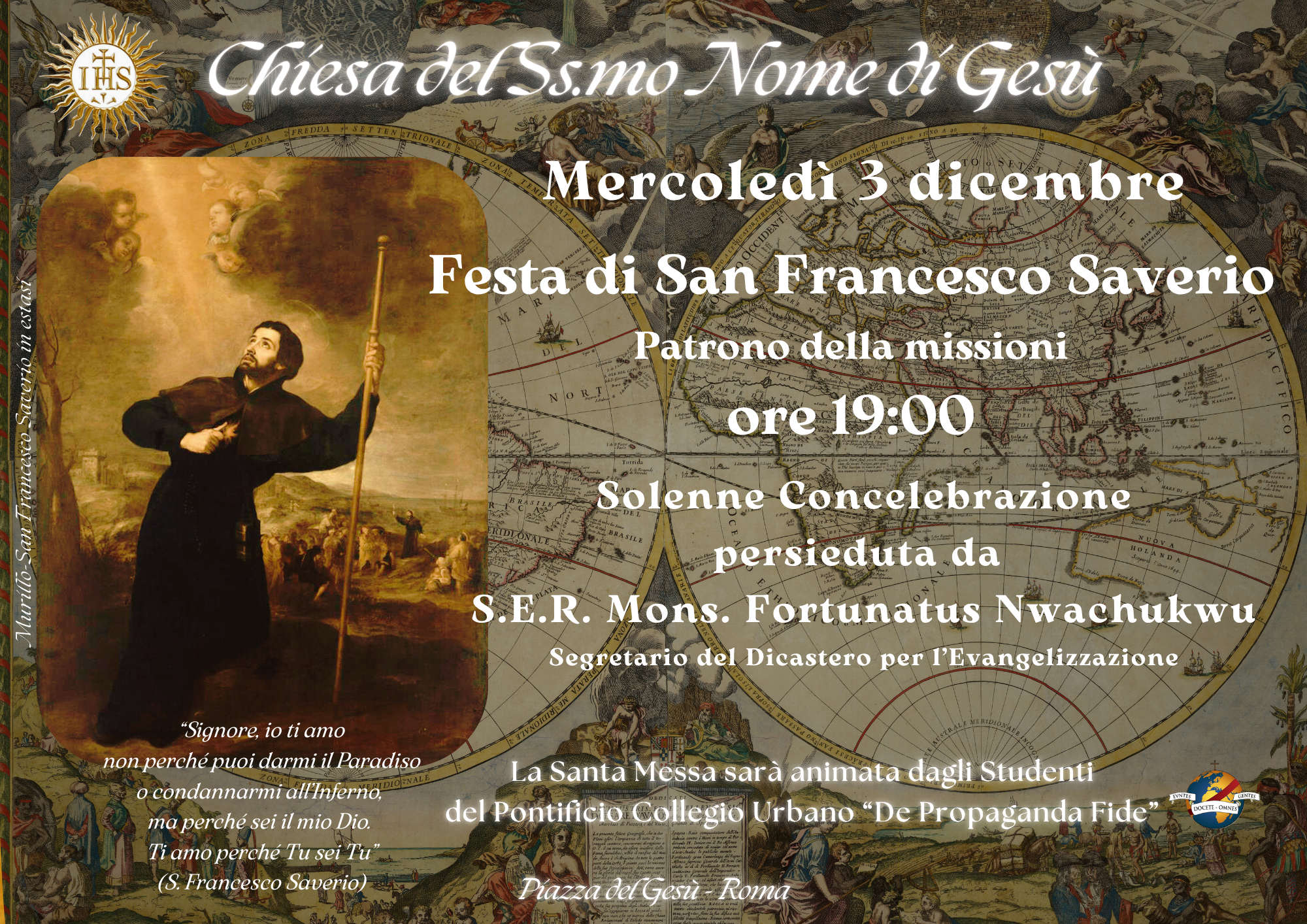 Mercoledì 3 dicembre 2025, alle ore 19:00, presso la Chiesa del Gesù, si svolgerà una solenne concelebrazione presieduta da Sua Eccellenza Reverendissima Monsignor Fortunatus Nwachukwu, Segretario del Dicastero per l’Evangelizzazione, in occasione della festa di San Francesco Saverio. La celebrazione sarà arricchita dall’animazione musicale degli studenti del Pontificio Collegio Urbano “De Propaganda Fide”.