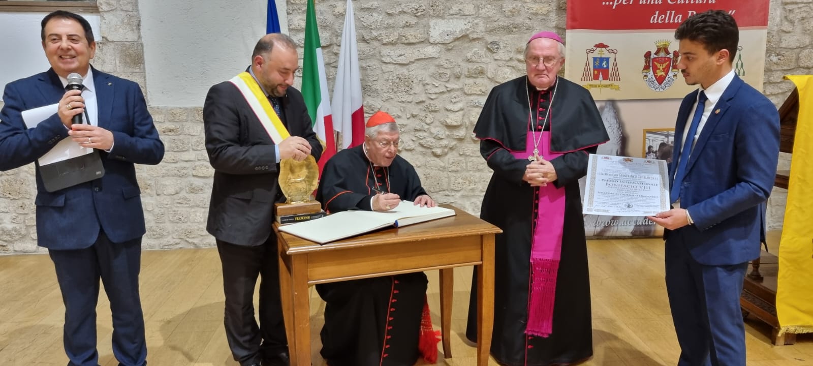 Il Cardinale Gianfranco Ghirlanda, S.J., è stato insignito del prestigioso Premio Internazionale Bonifacio VIII – Città di Anagni 2025, giunto alla sua XXIII edizione, dedicato alla promozione di una cultura della pace. La cerimonia di consegna si è svolta venerdì 28 novembre 2025 nella storica Sala della Ragione del Comune di Anagni, alla presenza di esponenti di rilievo del mondo accademico, civile, religioso e politico. Dopo la consegna del premio, è seguito un pranzo di gala in onore del Cardinale Ghirlanda.