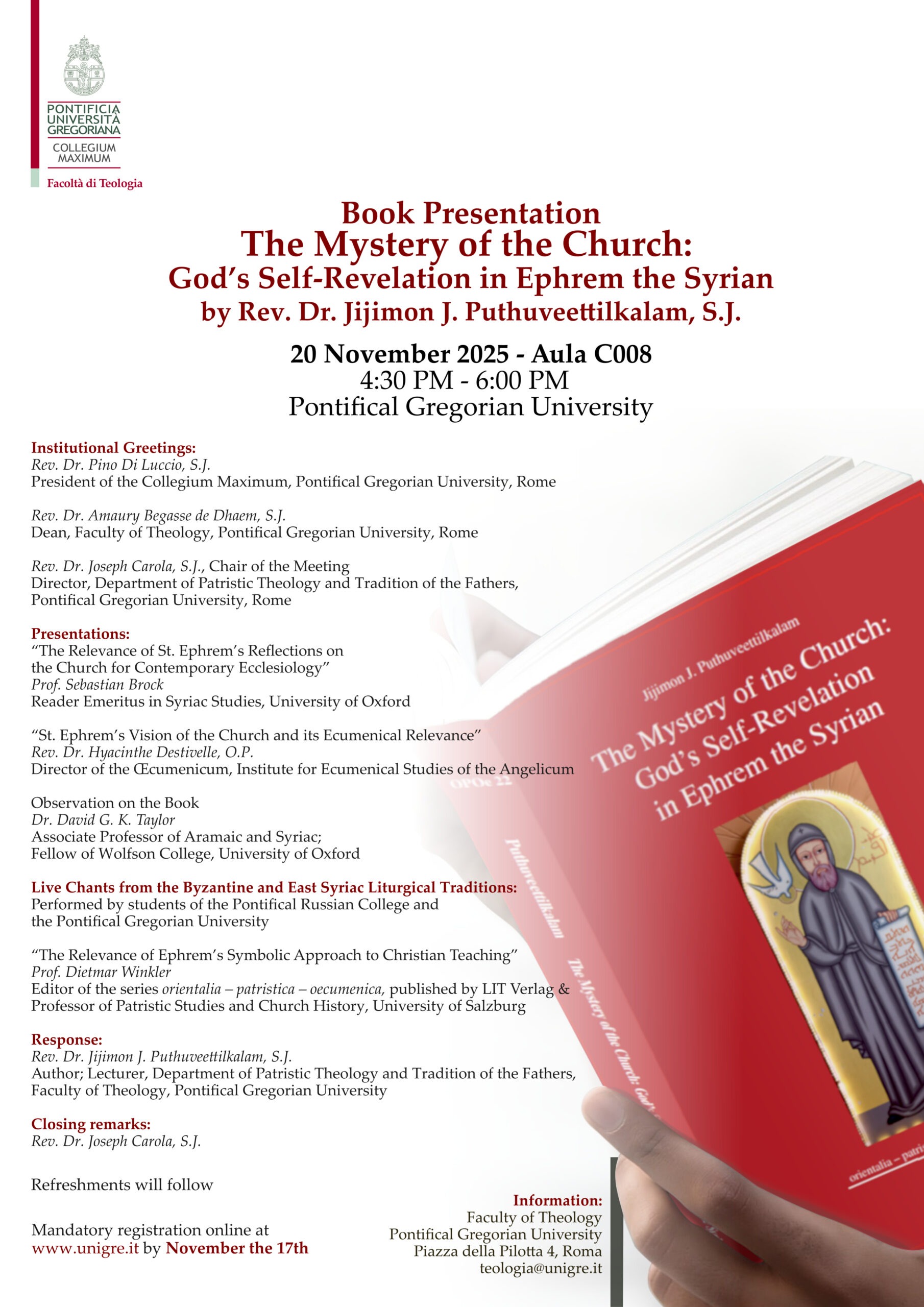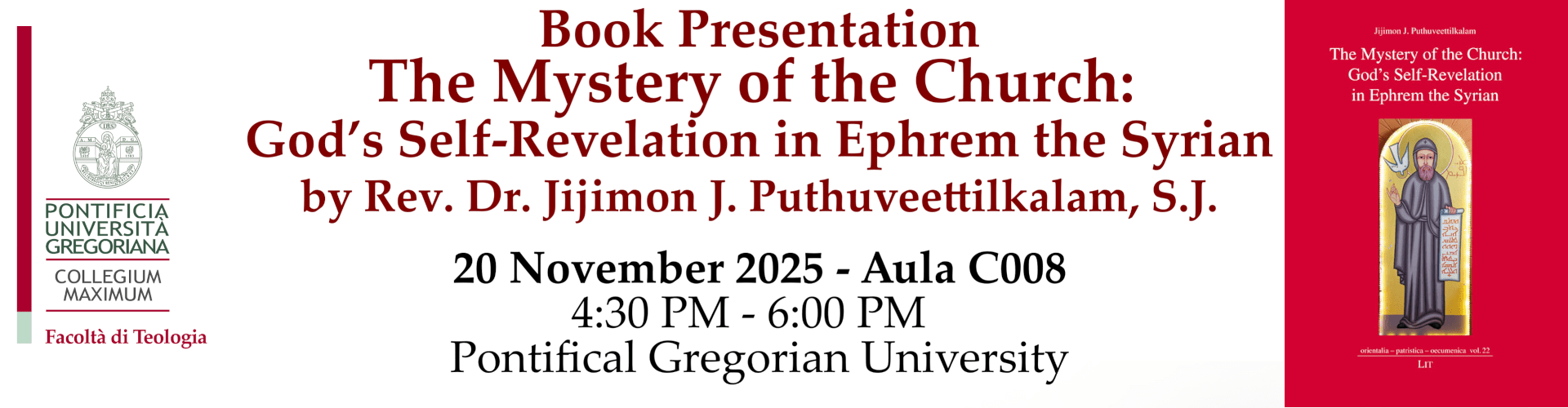 Il 20 novembre si è tenuta presso la Pontificia Università Gregoriana una partecipata presentazione del volume di padre Jijimon J. Puthuveettilkalam, S.J., The Mystery of the Church: God’s Self-Revelation in Ephrem the Syrian, pubblicato da LIT Verlag. Organizzata dalla Facoltà di Teologia del Collegium Maximum, l’iniziativa ha richiamato oltre cento persone, tra studenti, docenti e appassionati di teologia, a testimonianza del vivo interesse per la tradizione siriaca e per l’ecclesiologia di Efrem il Siro (c. 306–373), una delle voci più influenti della tradizione patristica siriaca.