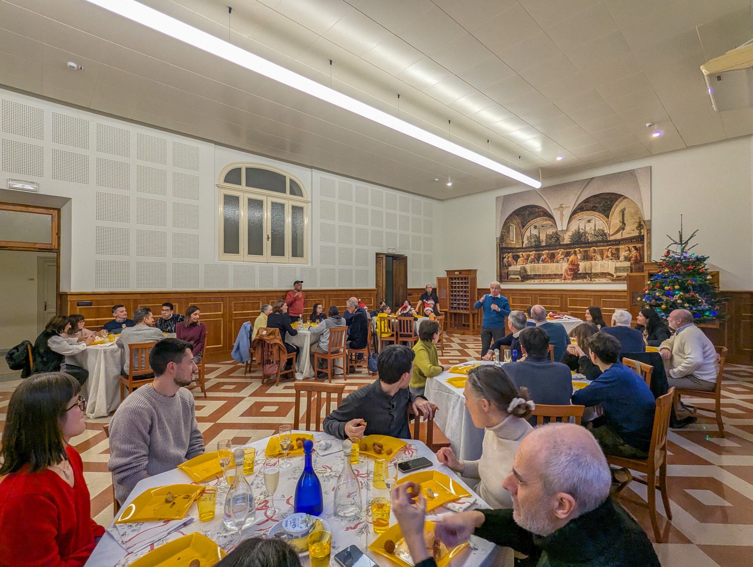Dopo l’Eucaristia, la comunità si è ritrovata in refettorio per un momento semplice ma vivace, pensato per esprimere la gioia e l’amicizia proprie di questo tempo dell’anno. P. Benoît Malvaux, S.J., superiore della comunità della Curia, ha rivolto a tutti un caloroso saluto, esprimendo riconoscenza per la dedizione, l’impegno e la collaborazione del personale lungo l’intero anno. Le sue parole hanno creato un clima di sincero apprezzamento e fraternità, ricordando come la missione della Curia sia frutto di uno sforzo condiviso e di una fiducia reciproca che si rinnova giorno dopo giorno.
