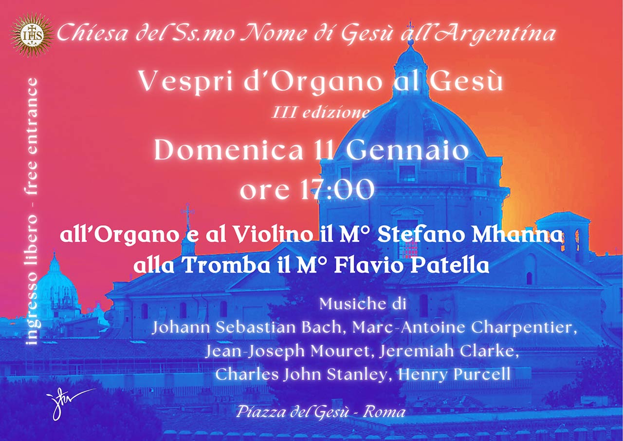 Ti aspetto domenica 11 gennaio p.v. alla III edizione dei Vespri d’Organo al Gesù, alle ore 17:00, all’Organo e al Violino il Maestro Stefano Mhanna, alla tromba il Maestro Flavio Patella con brani di Johann Sebastian Bach, Marc-Antoine Charpentier, Jean-Joseph Mouret, Jeremiah Clarke, Charles John Stanley, Henry Purcell.