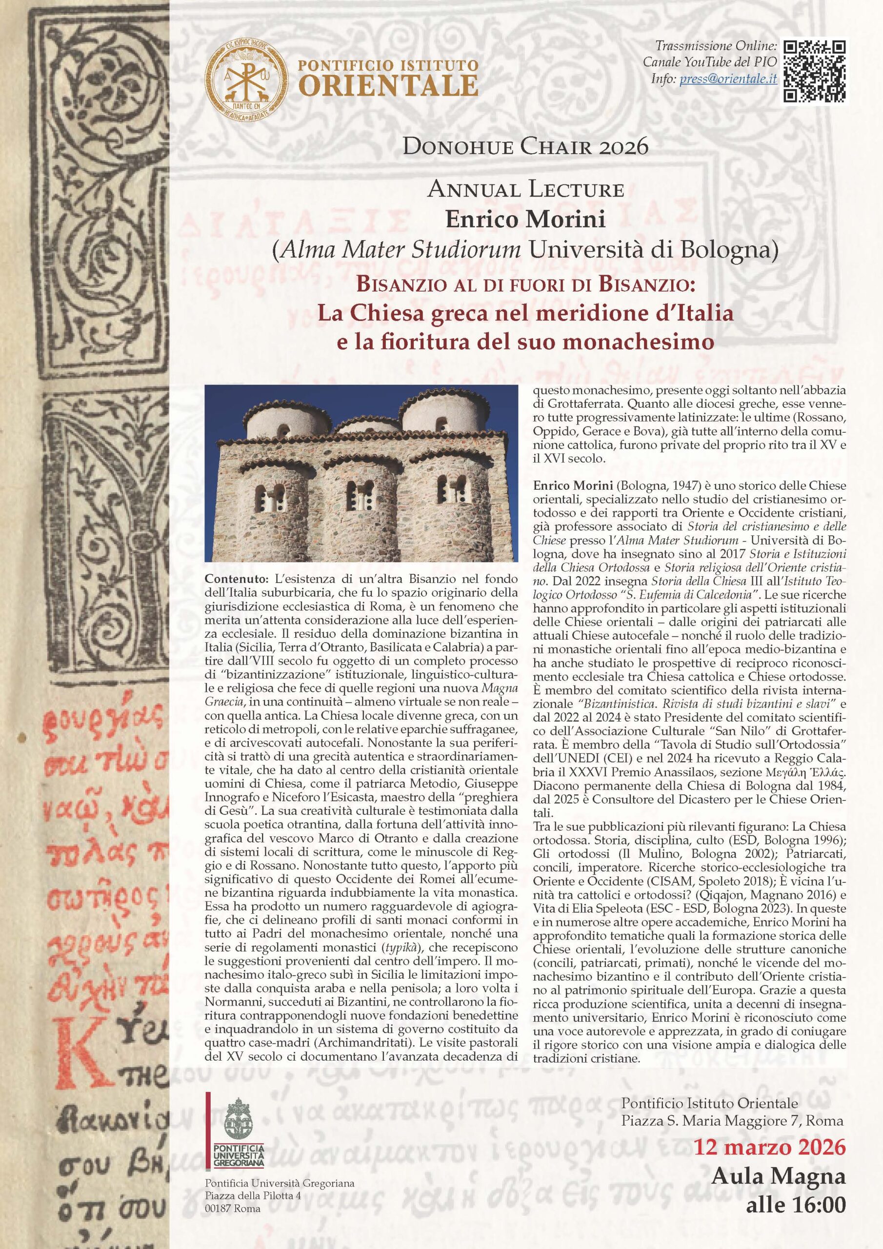 Giovedì 12 marzo 2026, alle ore 16:00, presso l’Aula Magna del PIO, nell’ambito del Donohue Chair 2026, si terrà l’Annual Lecture con il Prof. Enrico Morini dell’Alma Mater Studiorum – Università di Bologna. La conferenza, dal titolo “Bisanzio al di fuori di Bisanzio: La Chiesa greca nel meridione d’Italia e la fioritura del suo monachesimo”, offrirà un approfondimento sulla presenza bizantina nel Sud Italia, con particolare attenzione alla Sicilia, alla Calabria, alla Basilicata e alla Terra d’Otranto.