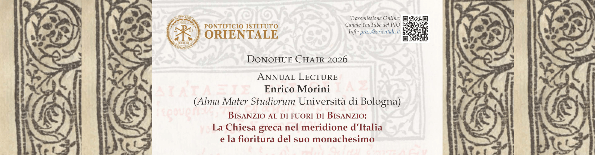 Giovedì 12 marzo 2026, alle ore 16:00, presso l’Aula Magna del PIO, nell’ambito del Donohue Chair 2026, si terrà l’Annual Lecture con il Prof. Enrico Morini dell’Alma Mater Studiorum – Università di Bologna. La conferenza, dal titolo “Bisanzio al di fuori di Bisanzio: La Chiesa greca nel meridione d’Italia e la fioritura del suo monachesimo”, offrirà un approfondimento sulla presenza bizantina nel Sud Italia, con particolare attenzione alla Sicilia, alla Calabria, alla Basilicata e alla Terra d’Otranto.